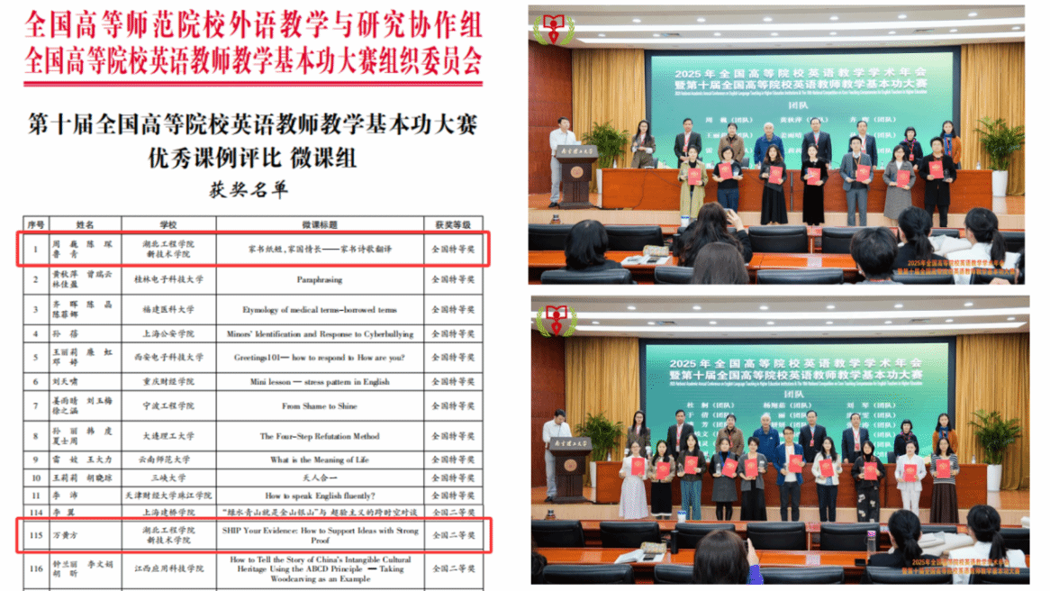 我校文法系教师凭借扎实的教学功底与创新实践脱颖而出:周巍、陈琛、鲁青团队的微课作品《Brief Letters, Deep Love - Translation of Chinese Family Letter poems》斩获“优秀课例评比·微课组”全国特等奖,万黄方老师的微课作品《Ship Your Evidence : How to Support Ideas with Strong Proof》荣获该组别全国二等奖。