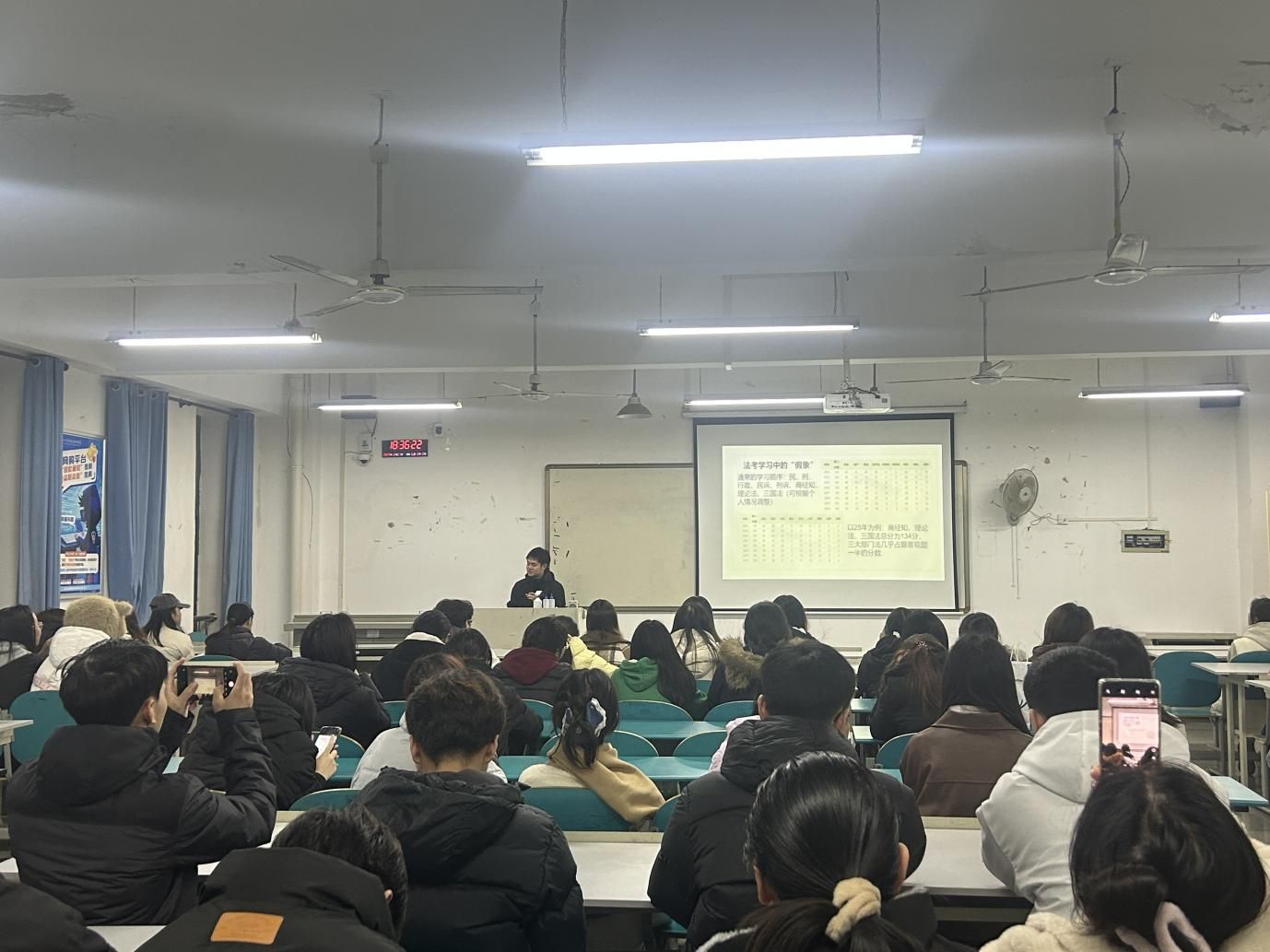 本次分享会于12月7日晚在科技楼508教室举行,23级法学全体学生到场参与。分享环节中,徐奕楷从备考规划、资料选择、学习方法、心态调整四方面展开分享。他提出要分基础夯实、强化提升、冲刺刷题三阶段制定个性化备考计划;建议资料选择宜精不宜多,重视官方指导案例;还分享了思维导图梳理知识点、错题归类复盘等实用技巧;同时提醒大家备考中要合理作息、互相监督,保持良好心态。