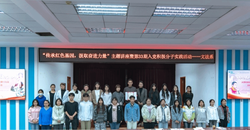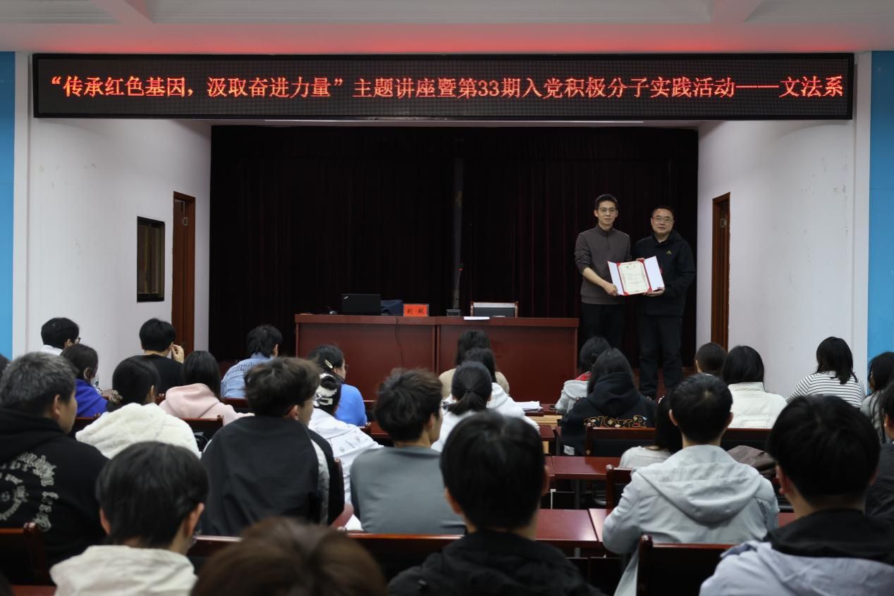 3月27日下午,文法系“传承红色基因,汲取奋进力量”主题讲座暨第33期入党积极分子实践活动在科技楼报告厅顺利开展。本次活动特邀中国人民志愿军老战士王清珍的后代——刘航担任主讲人,重点讲述以王清珍为代表的志愿军战士舍生忘死、保家卫国的感人事迹,深入阐释红色基因的新时代内涵,带领学子感悟前辈的家国情怀与奉献精神。随后蒋成副书记为刘航颁发“红色宣讲员”聘书。